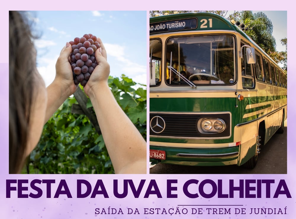 Neste roteiro vamos conhecer a famosa Festa da Uva de Jundiaí! A festa possui uma estrutura incrível e conta com muito artesanato, música, cultura, intervenções artísticas, além de muitas frutas fresquinhas! Também possui uma ampla área de alimentação, onde vocês poderão almoçar. Após o almoço, seguiremos para uma propriedade produtora de uvas, onde faremos a colheita de uvas direto do pé! Tudo o que for colhido, será pesado e pago pelo quilo, e vocês poderão levar para a casa uvas fresquinhas colhidas pela sua família!